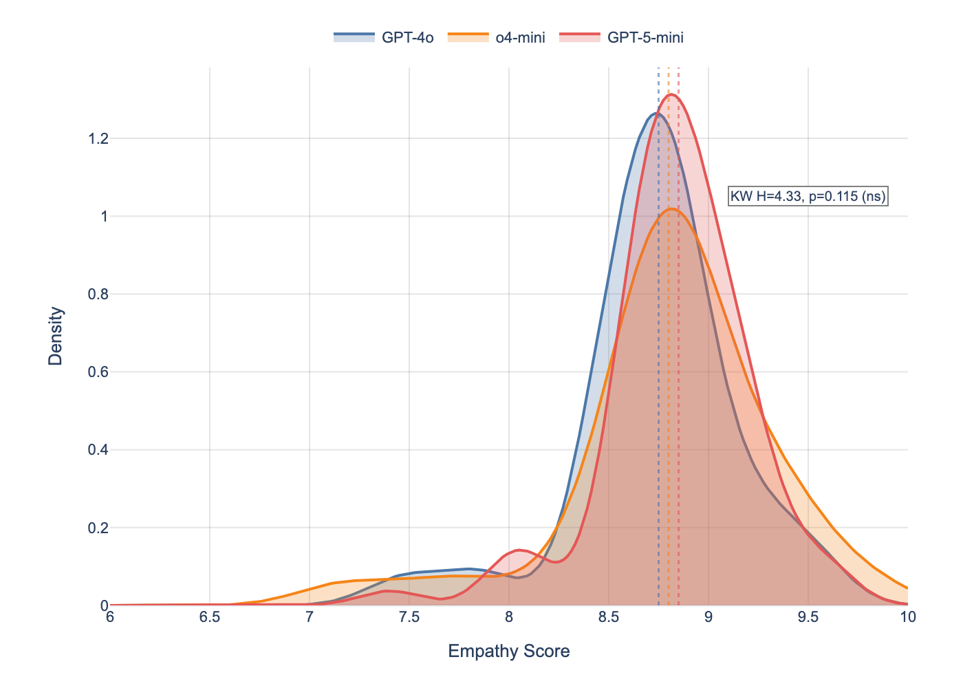 Figure 1: Kernel density estimates of empathy score distributions across three model generations (N=70 conversations per model). Vertical dashed lines indicate medians. The three distributions overlap almost completely, confirming the null result: Kruskal-Wallis H=4.33, p=0.115